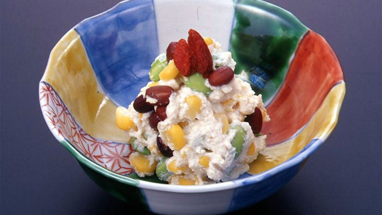 - 豆腐に胡麻を加えた中に一寸豆、コーン、小豆、を和える。